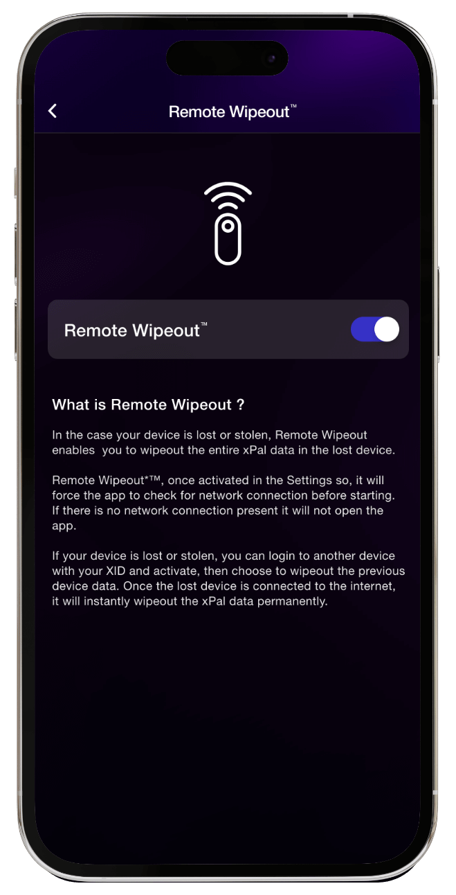 In the case your device is lost or stolen, Remote Wipeout enables you to wipeout the entire xPal data in the lost device.